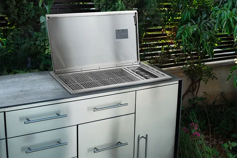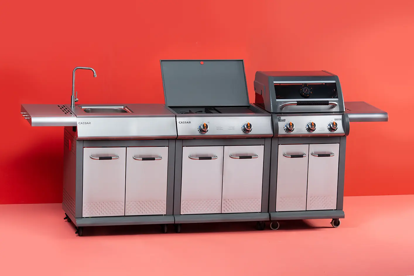 CAESAR GRILL הוא מטבח חוץ מודולארי המורכב מגריל גז עוצמתי ויחידות מטבח שונות כמו מקרר, מקפיא וכיור.