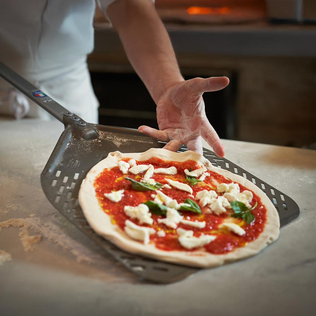 כפות הפיצה של Gi.Metal זריזות ומדויקות: הן משמשות לסיבוב הפיצה בתוך התנור, לבדוק באמצעותן את מידת העשייה על ידי הרמת התחתית והוצאת הפיצה כשהיא מוכנה. מידות הכפות שפותחו על ידי Gi.Metal מבטיחות את משטח עבודה מדויק.