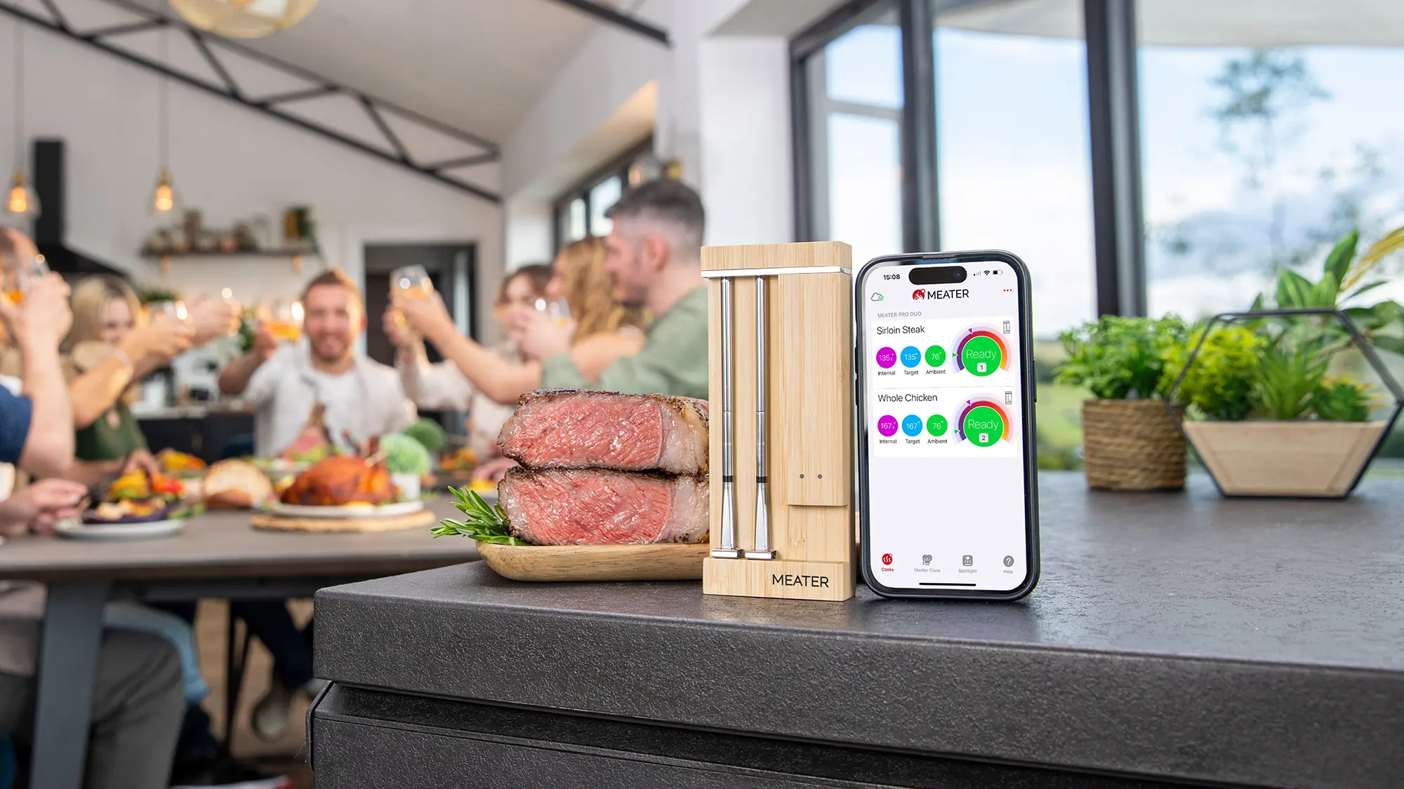 מדחום הבשר החכם האלחוטי MEATER מאפשר לכם להתרחק עד 165 מטרים מהגריל ולצפות בתהליך הבישול באפליקציה.