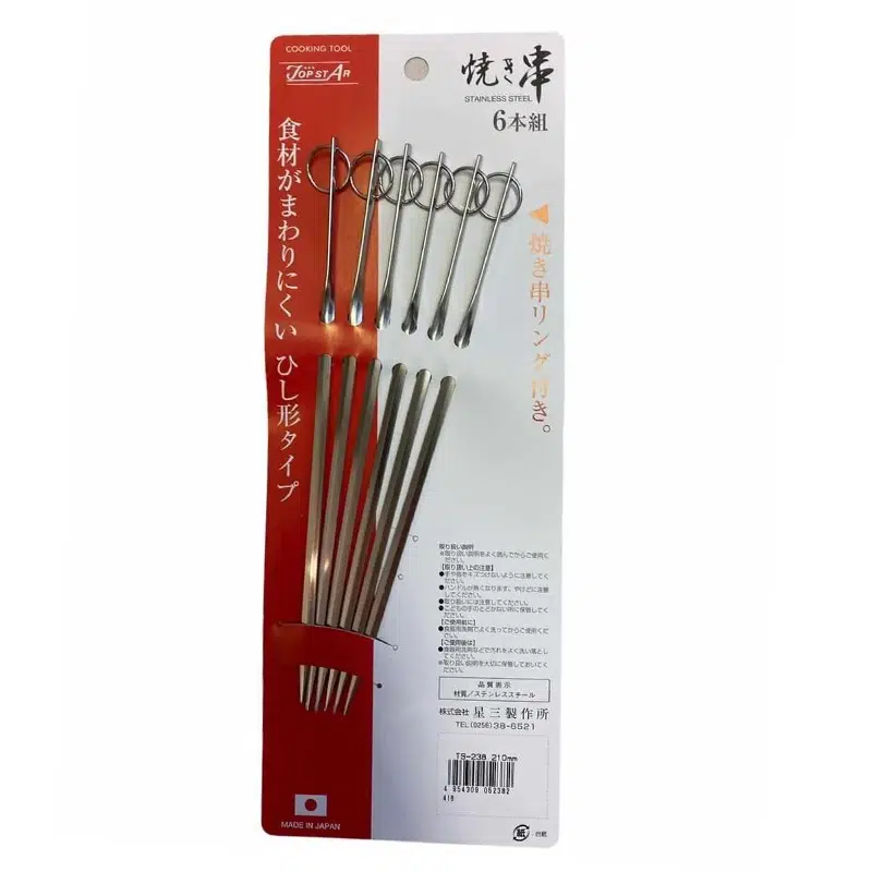 שיפודי יקיטורי מקצועיים מנירוסטה איכותית. מאפשרים צלייה נוחה ופשוטה של מגוון נתחים על גבי גרילי פחמים בסגנון היבאצ'י/קונרו(Hibachi/Konro). אורך השיפודים: 21 ס"מ. הסט כולל: 6 יח'. מיוצר ביפן! *בטוח לשימוש במדיח*