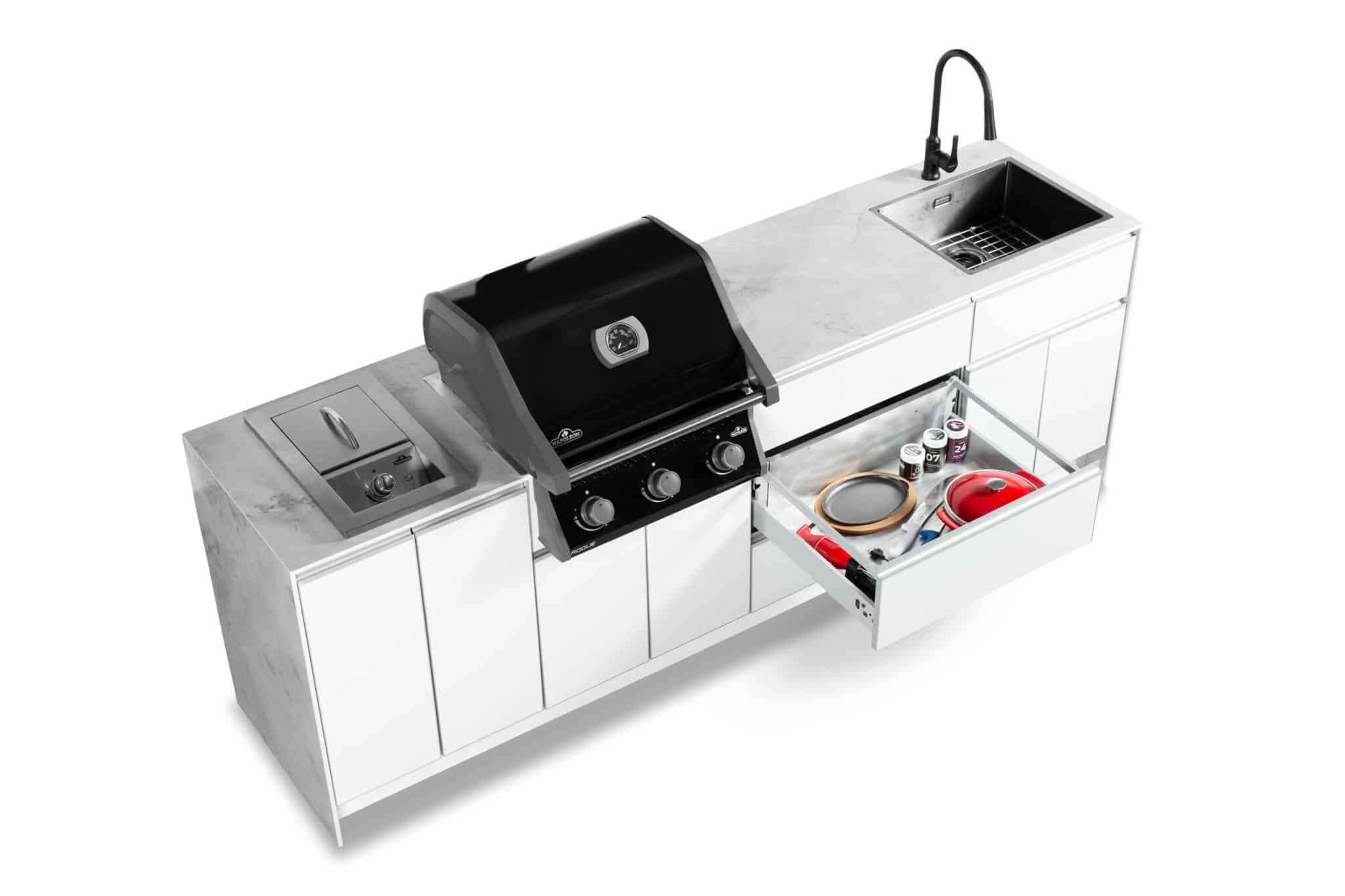הגריל מגיע עם ערכה לשינוי הגריל לBuilt In- הערכה כוללת שלושה חלקים שמתחברים באופן מדויק לחלק העליון של הגריל (ללא העגלה). שלושה מבערים מנירוסטה איכותית במיוחד בעוצמת חום של . סה”כ עוצמת חום של 42,000 BTU.
