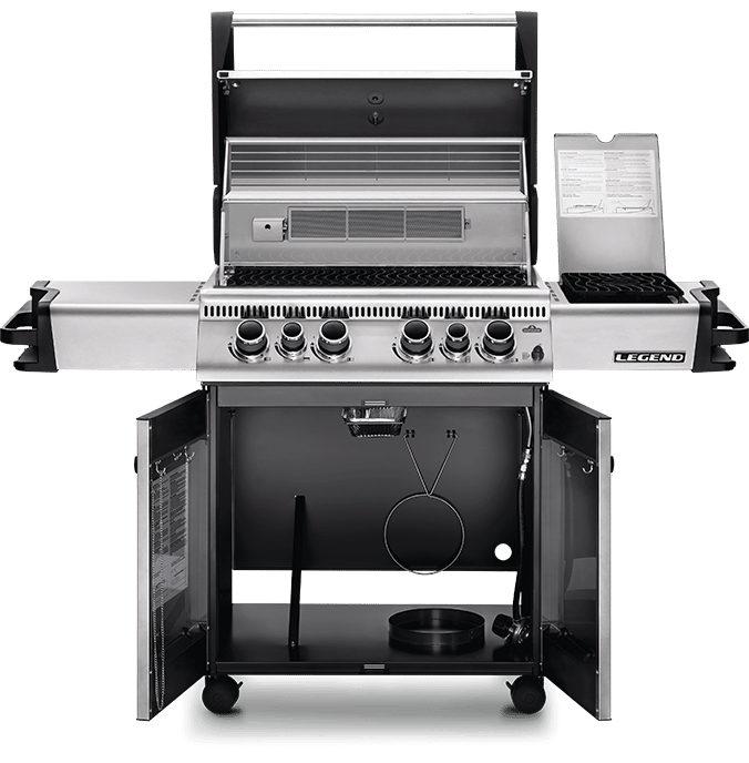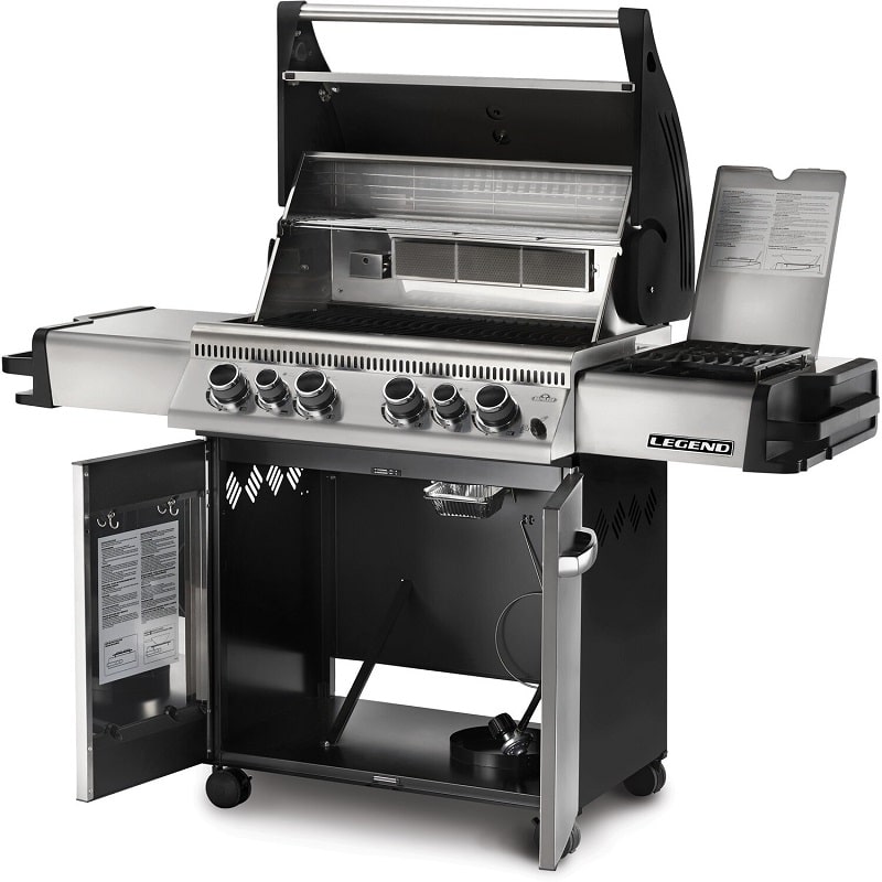 מפזרי להבה עשויים נירוסטה – ממוקמים בצורה מדורגת לפיזור חום והפחתת התפרצות הלהבה.מדף הגריל ניתן לקיפול, עם ווים לתליית אביזרי צלייה.