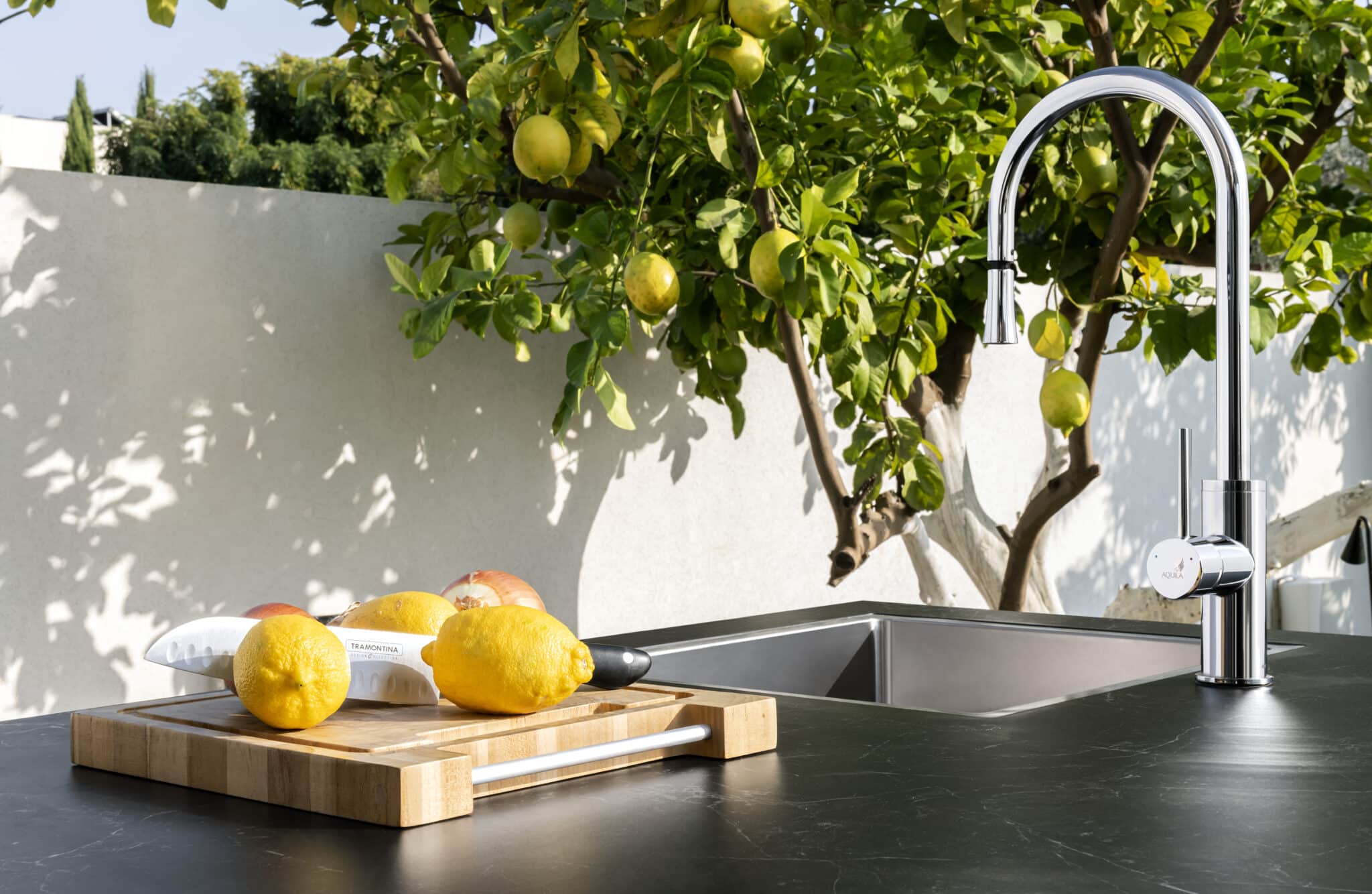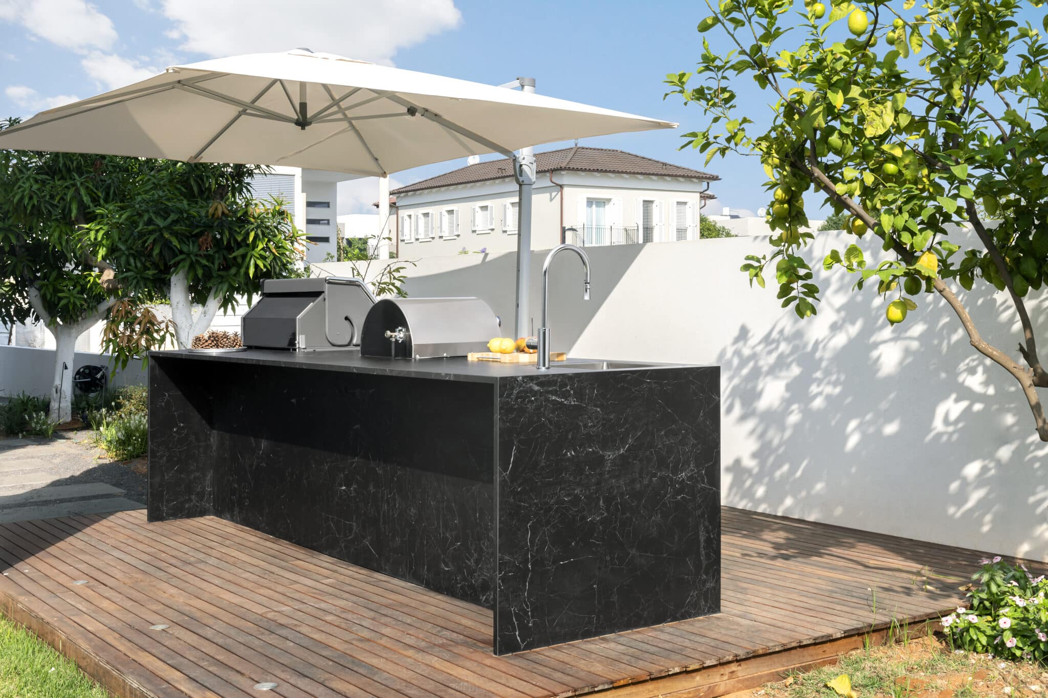 חיפוי משטח גרניט פורצלן כהה נבחר להשלמת המראה הנקי של המטבח, ופתרון הצללה איכותי להשלמת סביבת האירוח הנוחה והמפנקת על ידי שמשיית SUNFLEX מבית GLATZ .