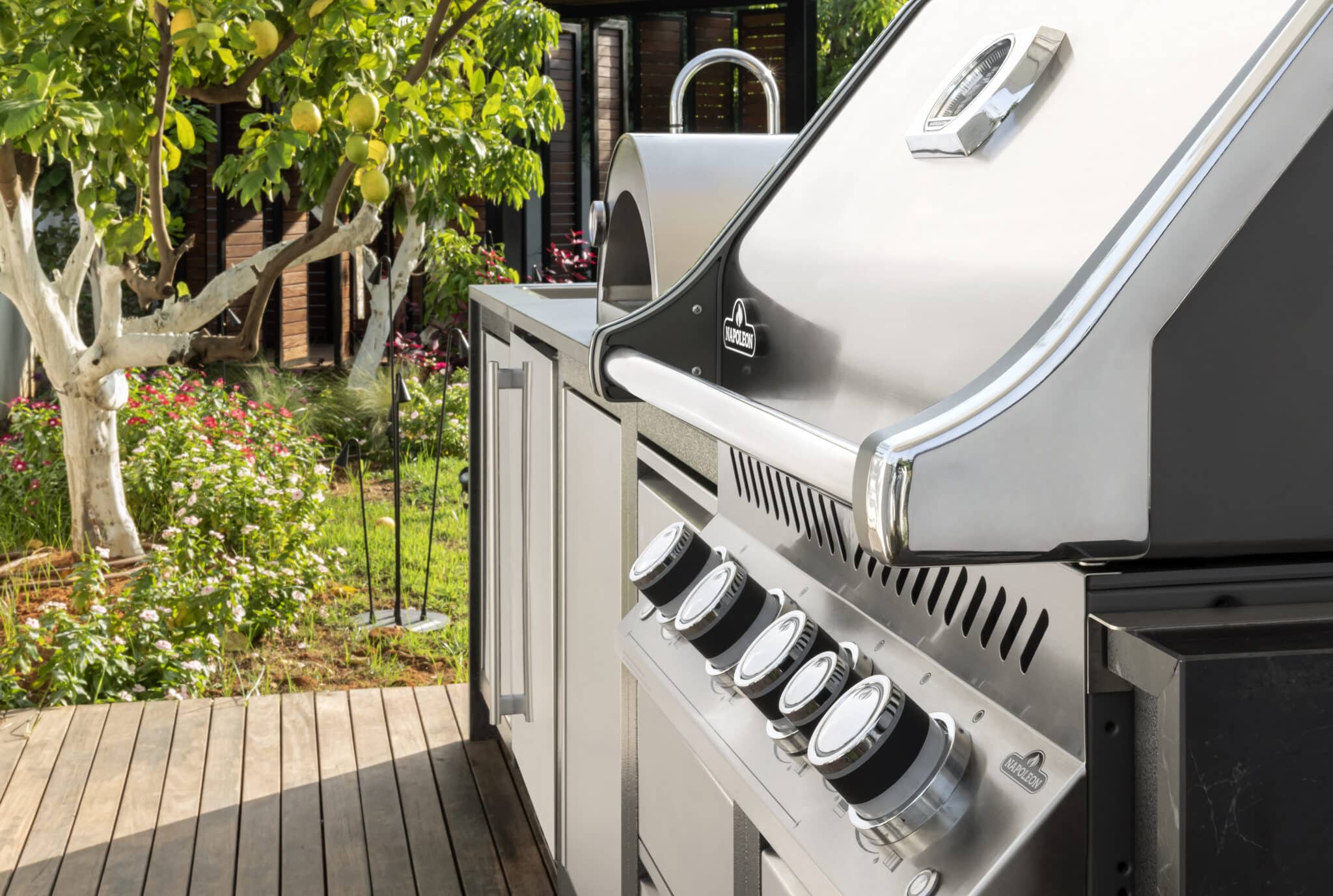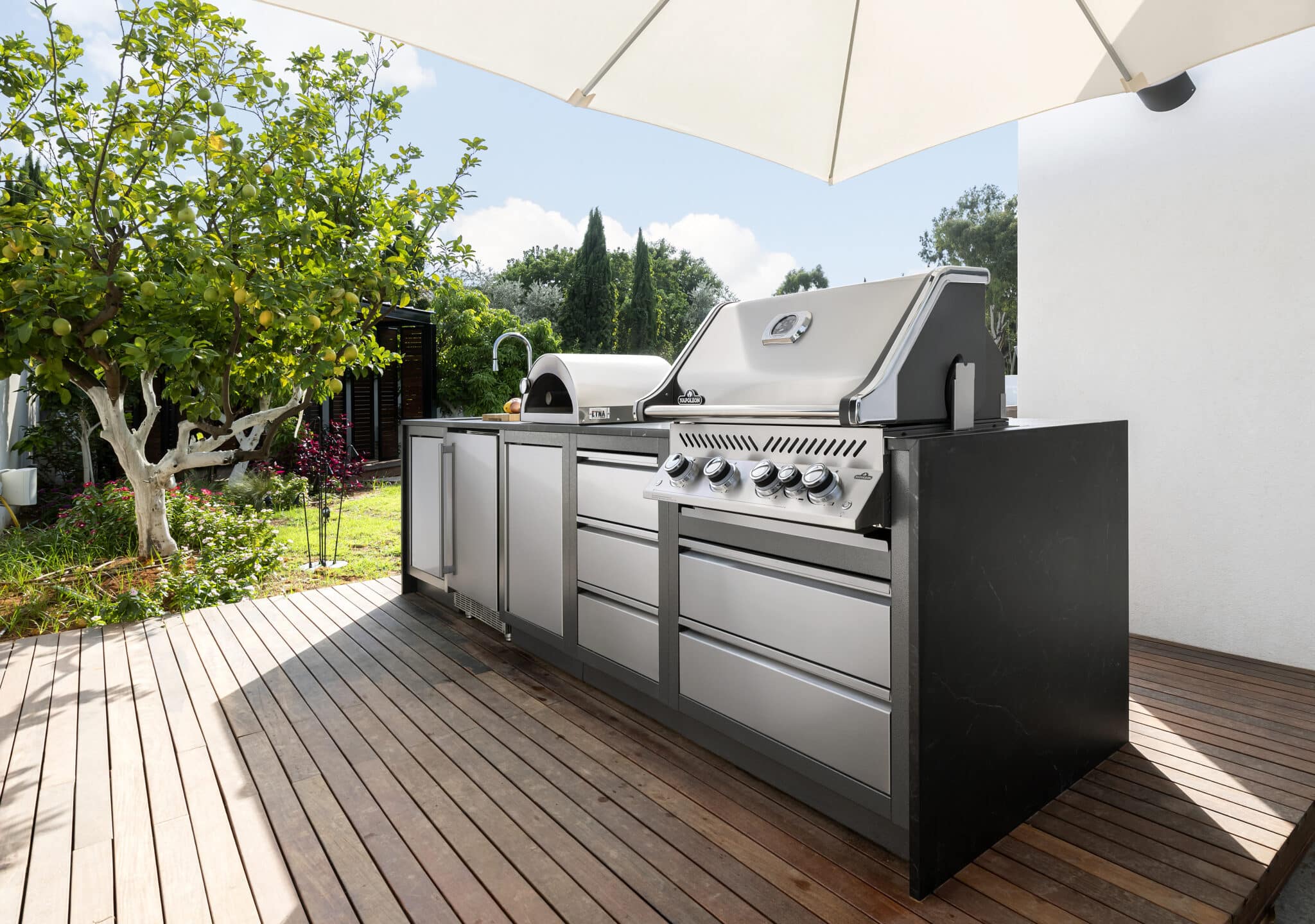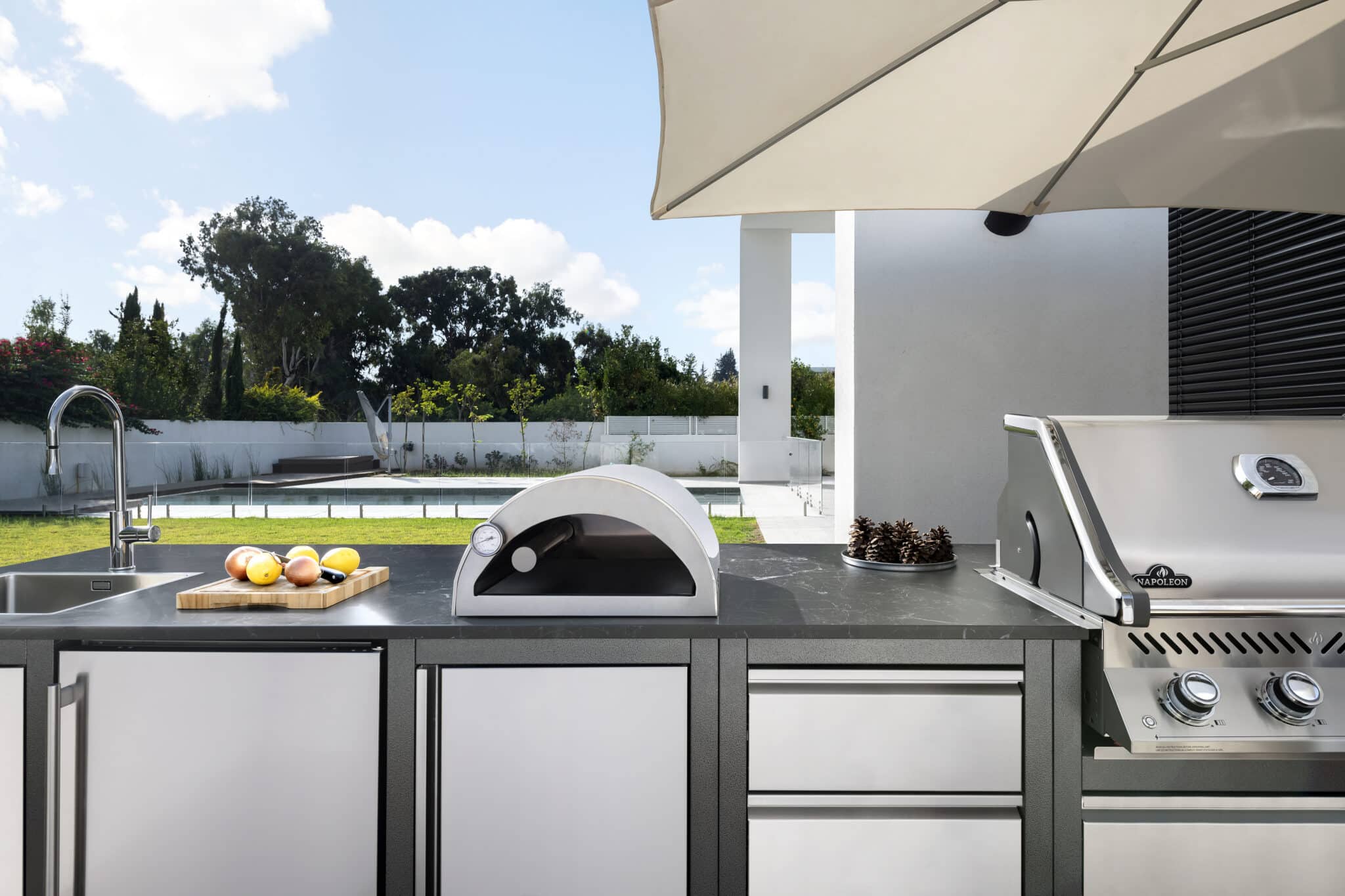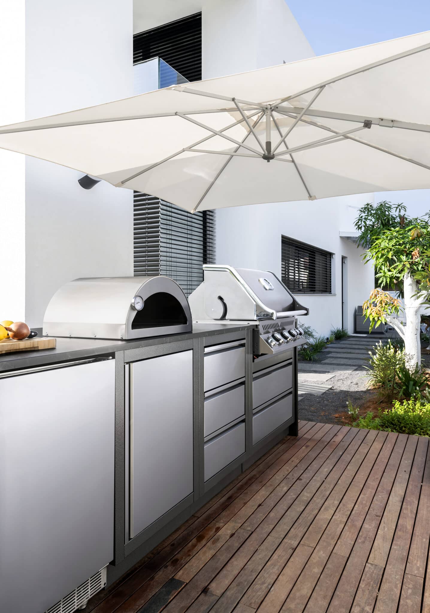 המטבח כולל: עמדת גריל בילט אין דגם PRESTIGE PRO 500 ועמדות מטבח ואחסון של סדרת Inifinity מבית NAPOLEON. בנוסף כולל גם כיור מבית TRAMONTINA, מקרר נירוסטה VULCAN160 מבית CAESAR וטאבון מסורתי ETNA מבית FORNO ALLEGRO.