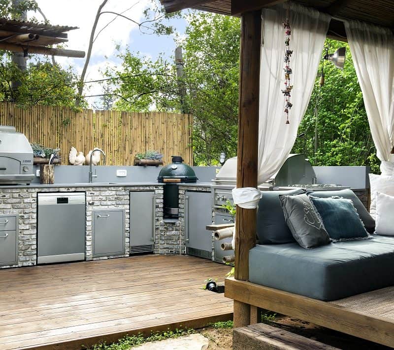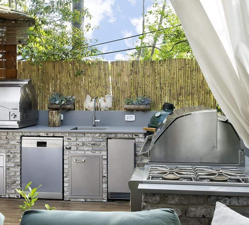 מטבח חוץ בעל מראה כפרי-מודרני, הודות לשילוב הבריקים וחיפוי גרניט פורצלן.