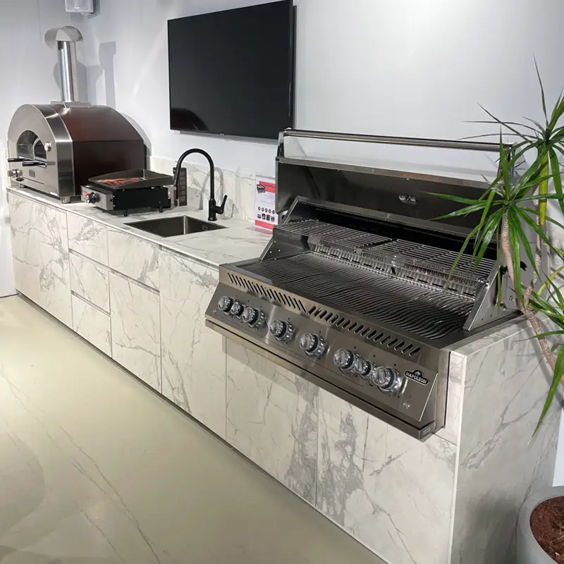 מטבח חוץ בנוי מאלומיניום משולב חזיתות גרניט פורצלן outlet – אולם תצוגה הרצליה